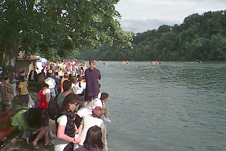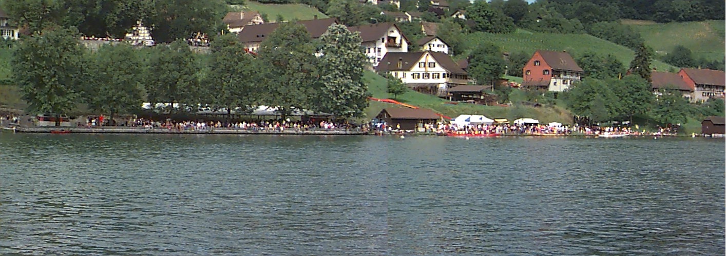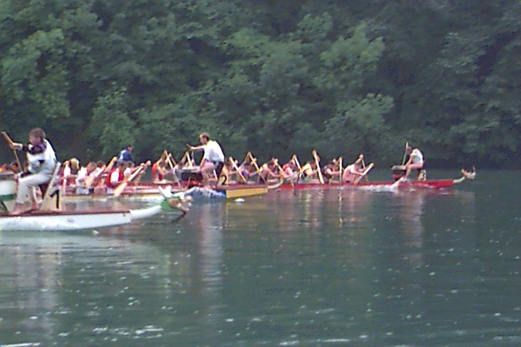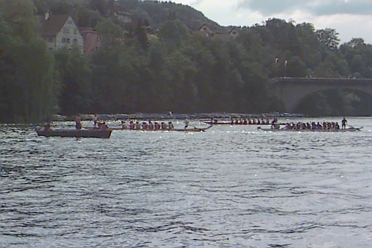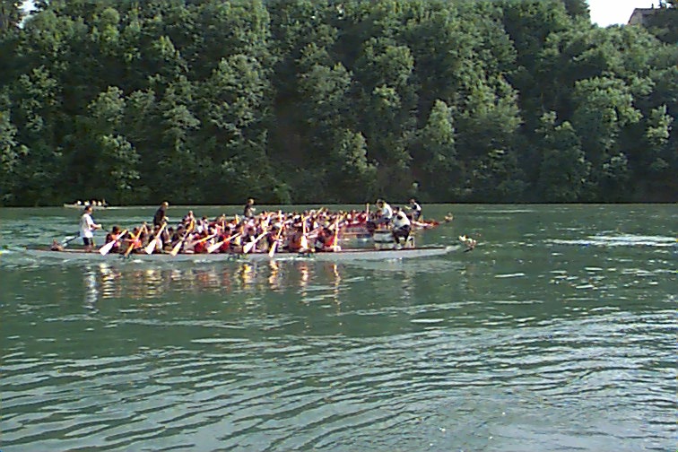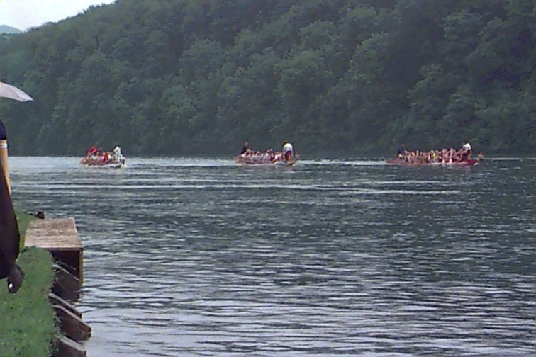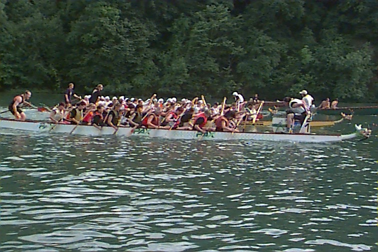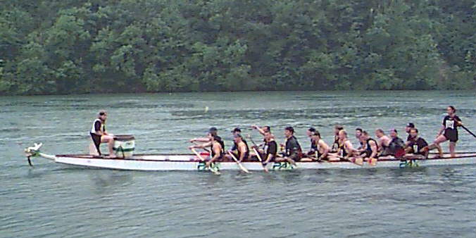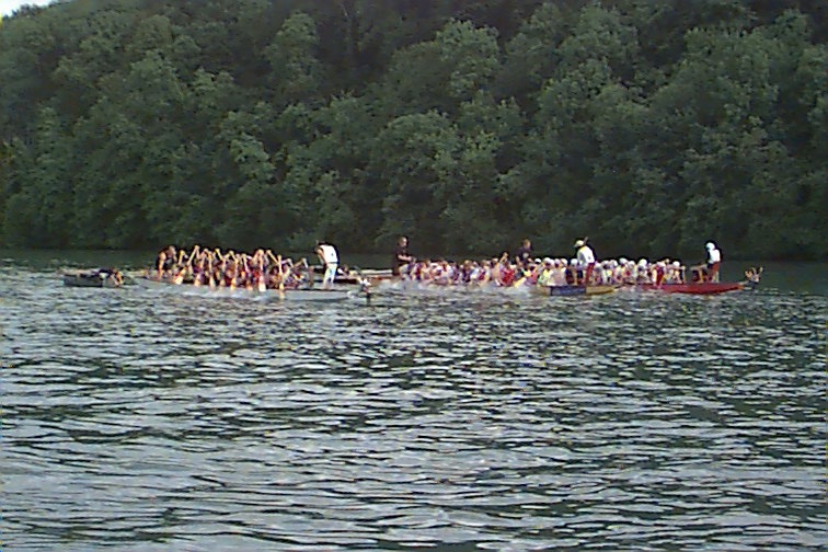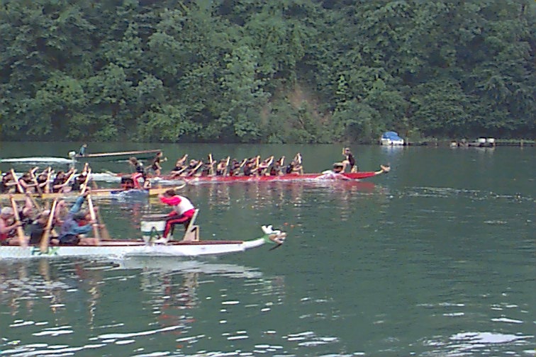 Der Finallauf in der Kategorie Elite. Gewonnen haben die Dresden Bulls (hinterstes Boot im Bild) vor dem Drachenbootclub Basel und dem Drachenbootclub Eglisau (106kByte) |